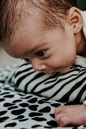 One side features the “baby” print (for newborn to ~4 months), the flip side shows the “brazil” print (for 5+ months). The transition gives your little one fresh visual appeal as their vision evolves. -
