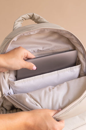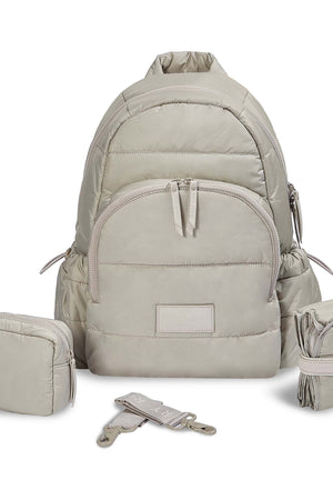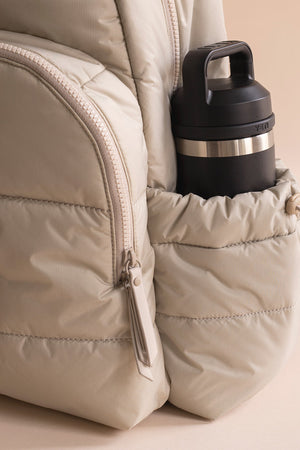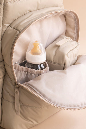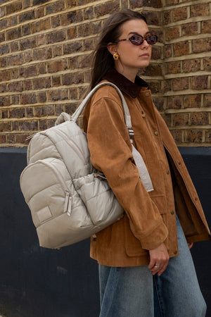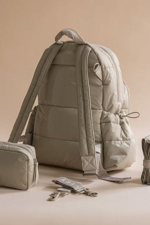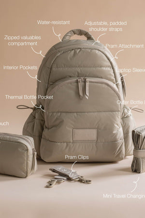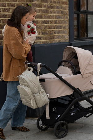 Meet our new Baby Changing Backpack in Oyster – a stylish, sustainable, and ultra-functional changing bag backpack designed for parenting adventures. Made from recycled, water-resistant materials with a puffy quilted finish. The perfect choice for parents who want a changing bag will last from newborn days to toddler travels and beyond.