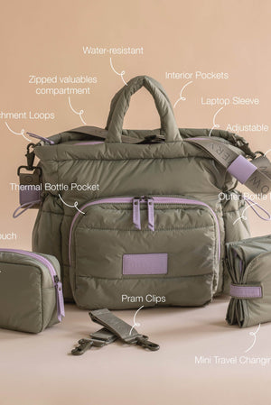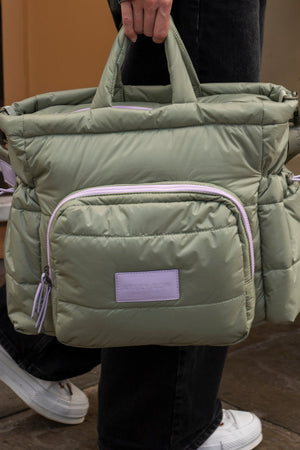 Meet our new Baby Changing Tote Bag in Olive – a stylish and practical baby changing bag designed to support you from newborn to toddler years. Crafted from recycled, water-resistant materials, this puffy quilted tote is as stylish as it is functional – the perfect everyday baby changing bag for modern parents on the go.