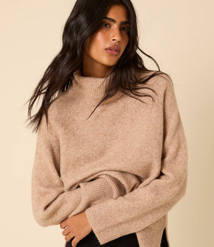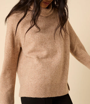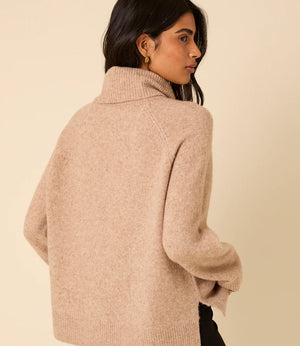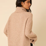 It’s designed with a relaxed fit so it sits gently over your stomach without squeezing. The roll neck keeps your neck warm, and the long sleeves offer comfort and coverage. Ribbed trims define the edges, while subtle side slits add a little ease when you need it.