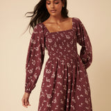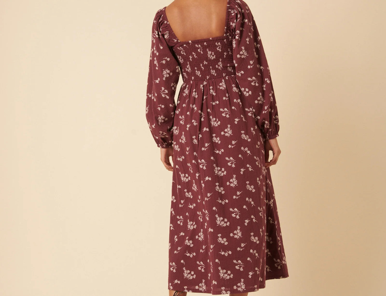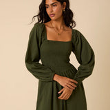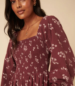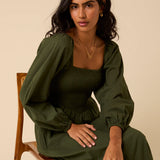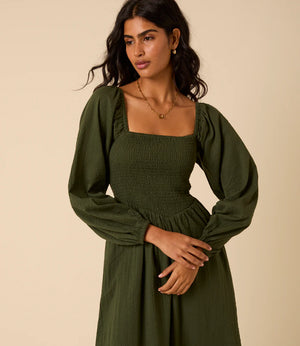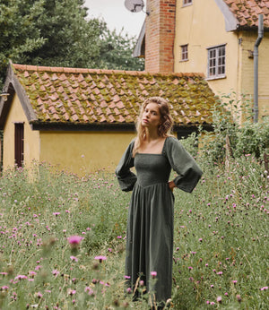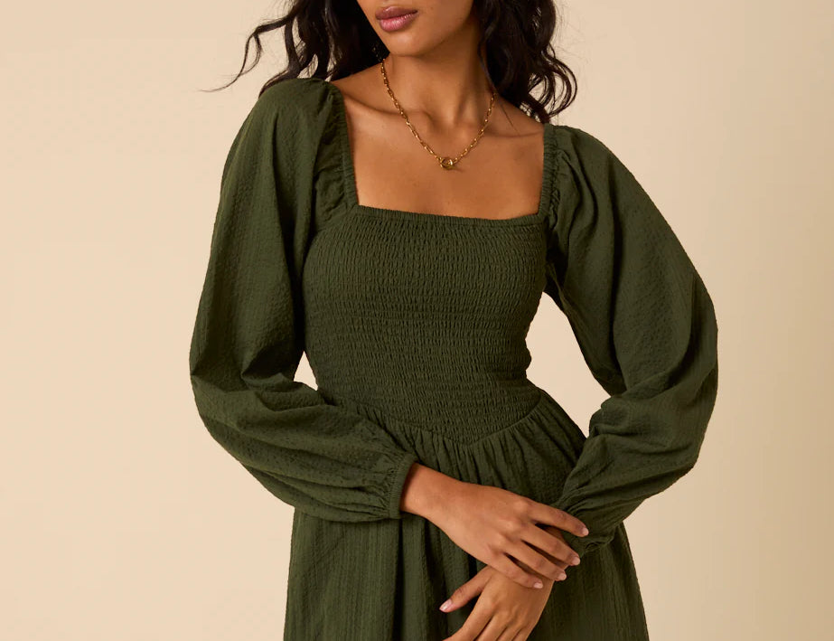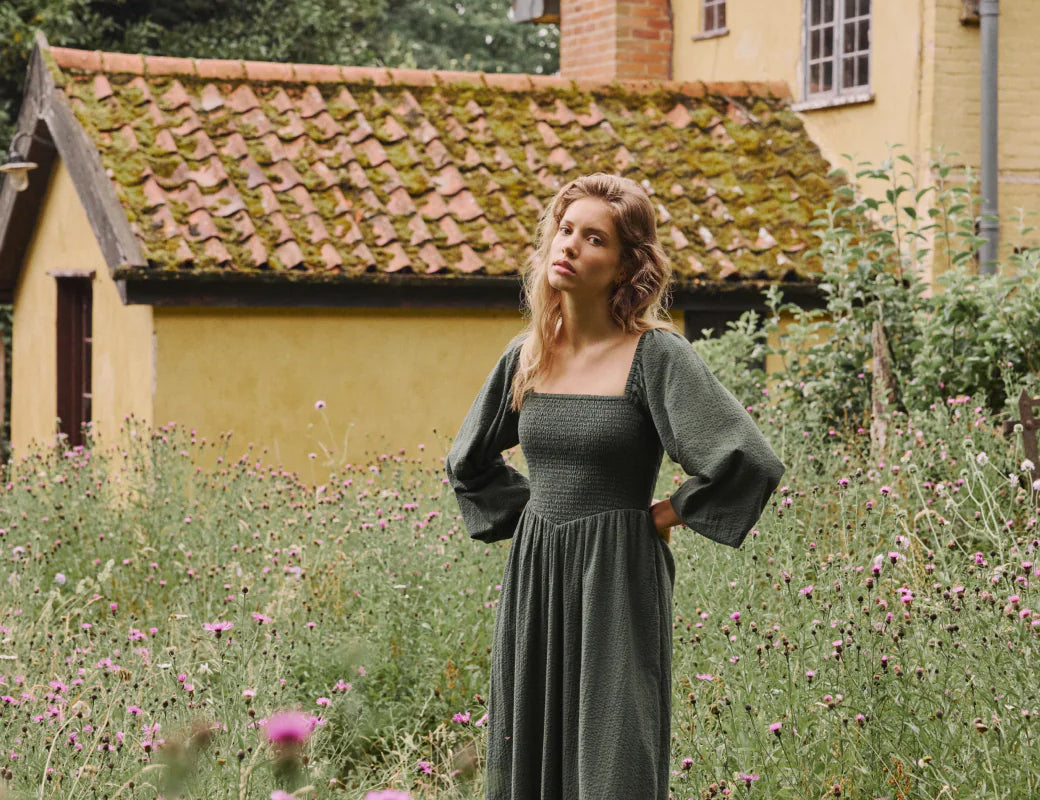 It features a square neckline and long sleeves for balance and coverage. The bodice and back are shirred so they stretch gently over your changing shape without tugging. The drop waist leads into a relaxed skirt that softly skims over your stomach and hips. You’ll also find practical side pockets, making it useful as well as pretty.