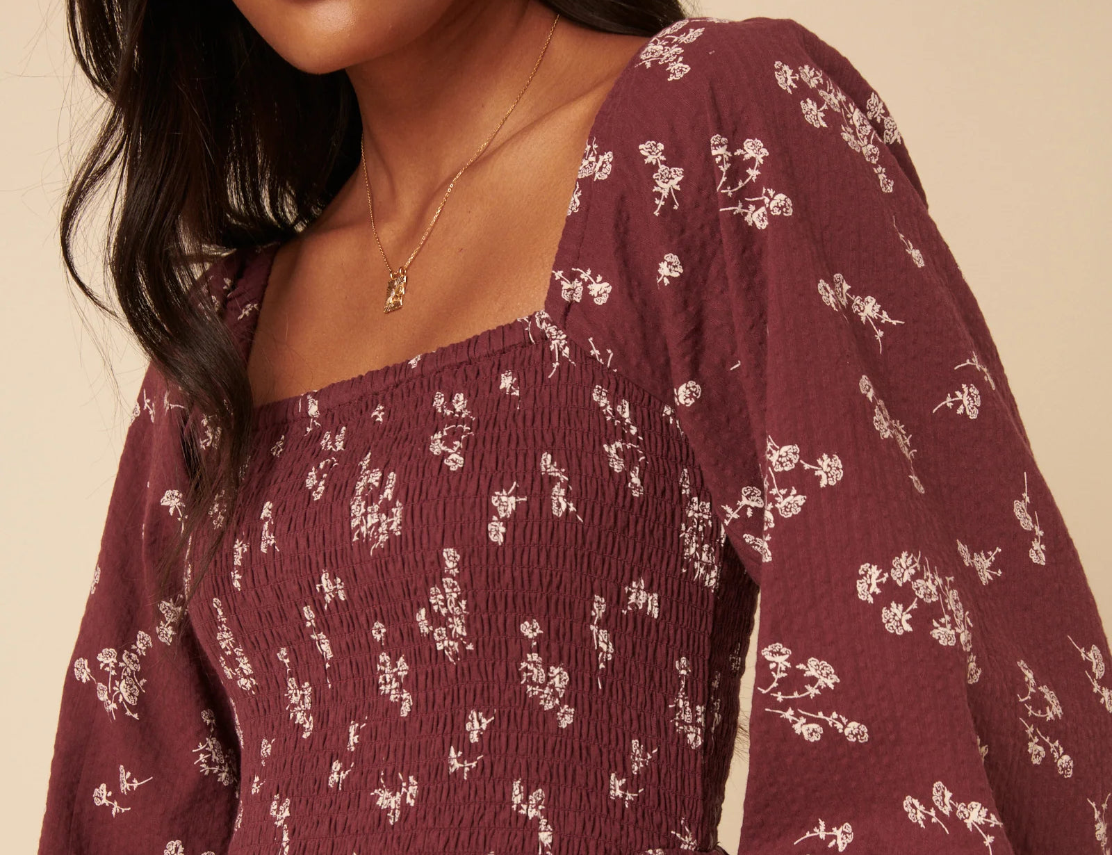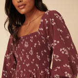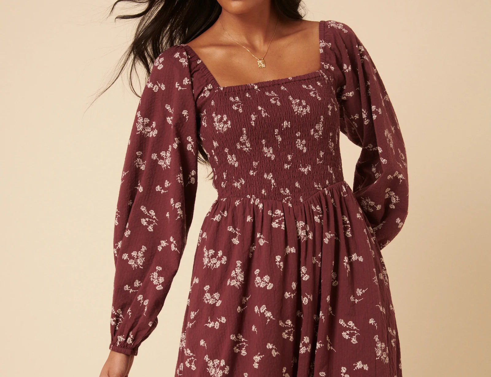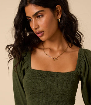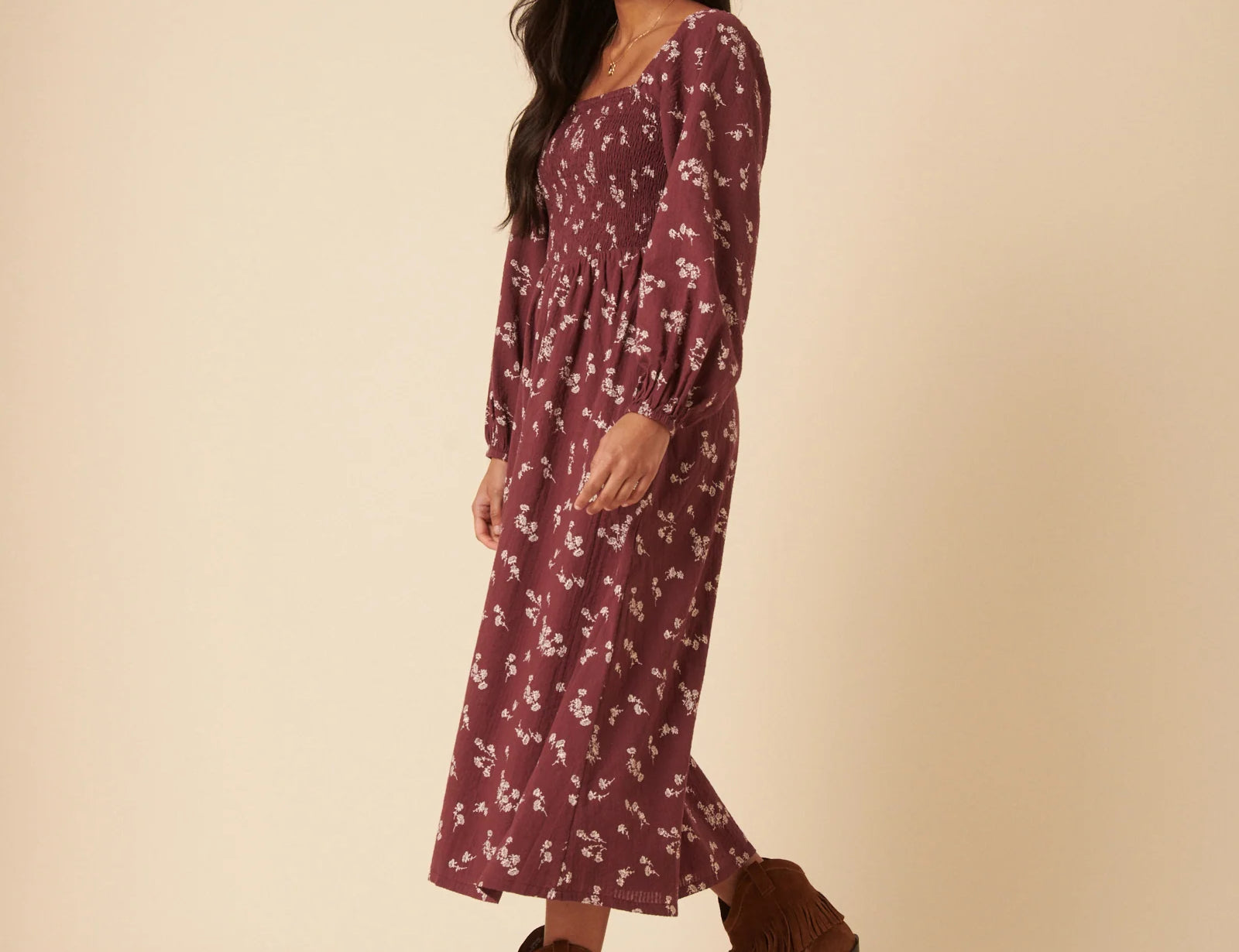 It features a square neckline and long sleeves for balance and coverage. The bodice and back are shirred so they stretch gently over your changing shape without tugging. The drop waist leads into a relaxed skirt that softly skims over your stomach and hips. You’ll also find practical side pockets, making it useful as well as pretty.