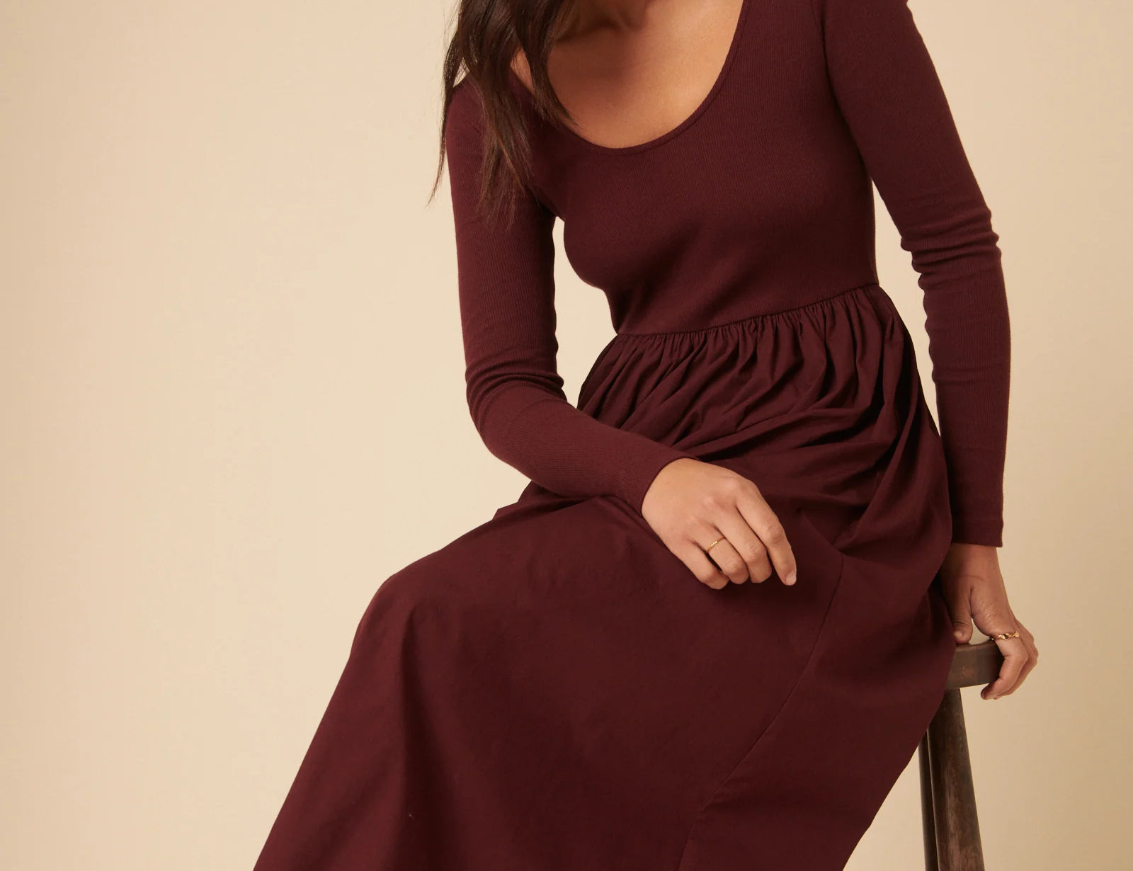 The bodice fits close but has stretch, so it hugs your curves while giving space over your stomach. Then the gathered skirt flares out from the waist, giving you plenty of room through hips and motherhood changes. Long sleeves bring coverage and comfort. A scoop neck keeps it simple and classic. There’s a low back detail that adds a little elegance when you want to feel dressed up.