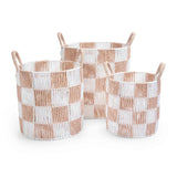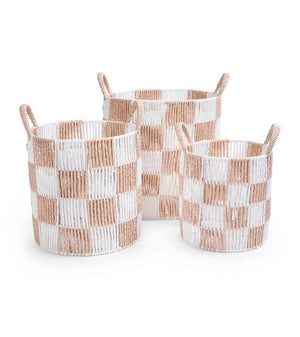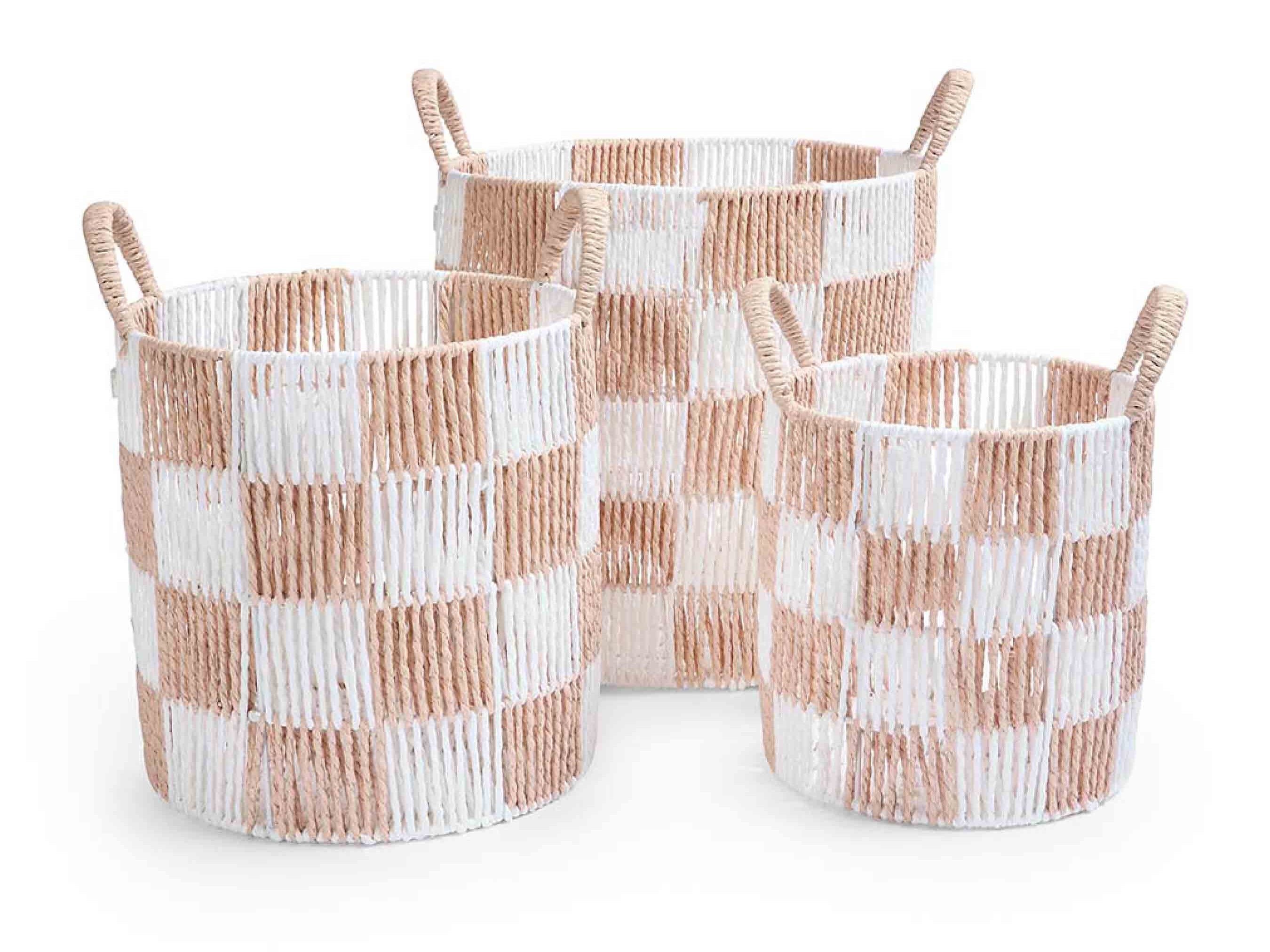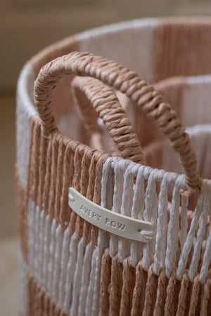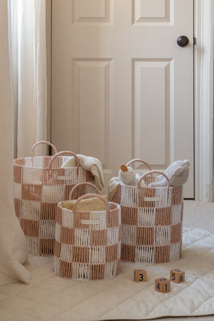 Add a touch of fun and practical storage to your little one’s room with our Checkerboard Baskets. The contemporary nude check design brings a playful pop of colour to any space. Made with paper wrapped around a sturdy wire frame, these baskets are both beautiful and durable.