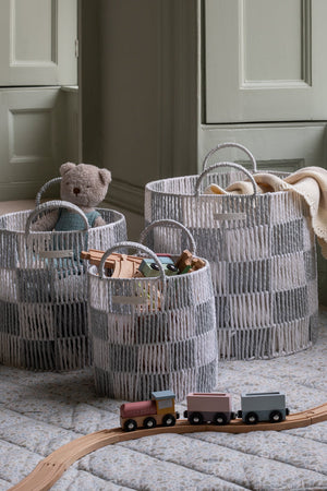 Add a touch of fun and practical storage to your little one’s room with our Checkerboard Baskets. The contemporary powder blue check design brings a playful pop of colour to any space. Made with paper wrapped around a sturdy wire frame, these baskets are both beautiful and durable.