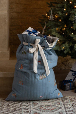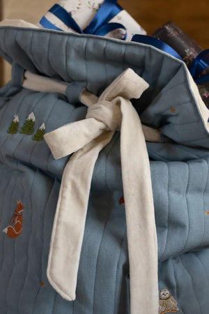 The Christmas Present Sack – Owlet & Friends is a soft, charming way to hold holiday surprises. Made from quilted organic cotton, the sack features a whimsical owlet motif alongside woodland friends, giving it a cozy storybook feel. A drawstring top lets you close it securely while maintaining a gathered, elegant shape.
