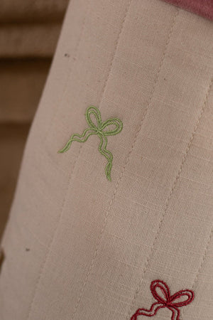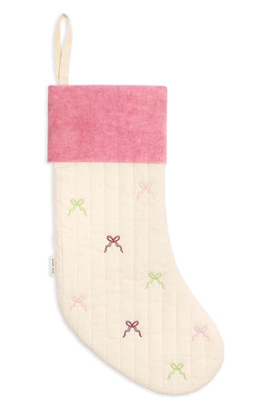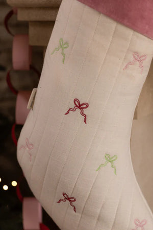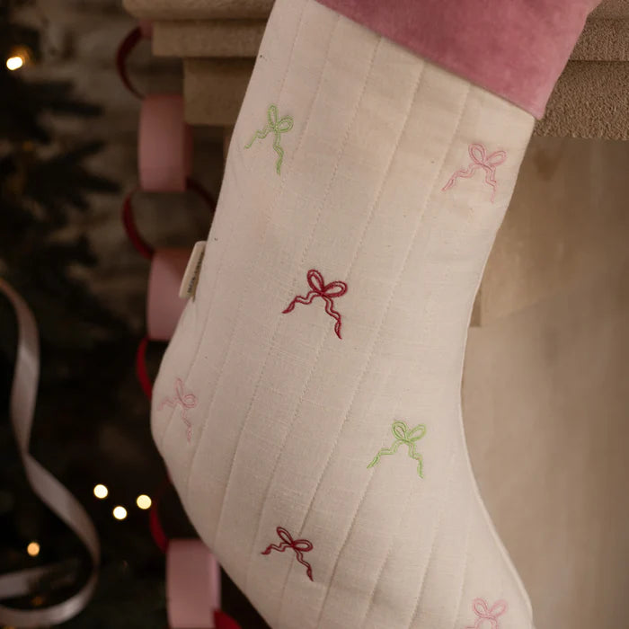 The Christmas Stocking – Bows adds a delicate festive touch with its soft, quilted design in natural tones. Featuring embroidered bow motifs, it gives a graceful and classic look under the tree or on the mantel. The opening is generous enough to slip in small gifts or treats, and a hanging loop ensures it’s easy to display wherever you like — on shelves, stair rails, or wall hooks.