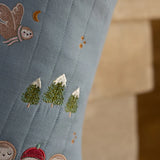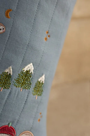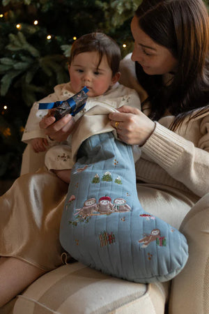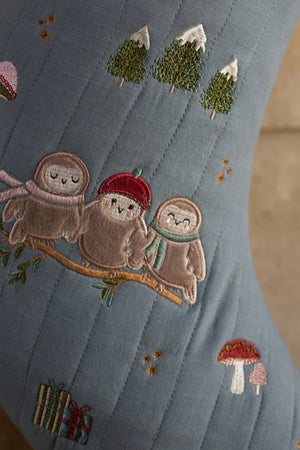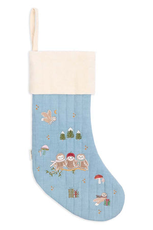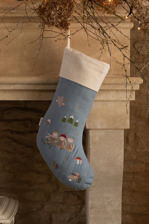 The Christmas Stocking – Owlet brings soft charm and classic style to your holiday décor. Crafted from lightly quilted organic cotton, it features delicate embroidered motifs and a luxurious velvet cuff. The roomy design makes it perfect for storing gifts, treats, or small keepsakes. A hanging loop lets you display it easily on mantels, stair rails, or walls.