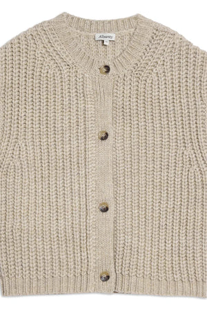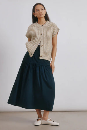 It’s crafted from a soft wool-blend in a chunky rib knit, with a flattering V-neckline and horn-effect buttons down the front. The relaxed cut means it sits comfortably over your stomach and layers well whether you’re in pregnancy or postpartum. Wear it solo over a tee, or layer under a jacket or coat for extra warmth. Its versatile design makes it a year-round favourite.