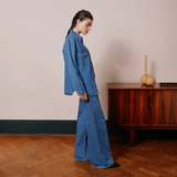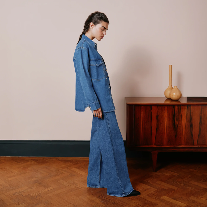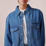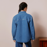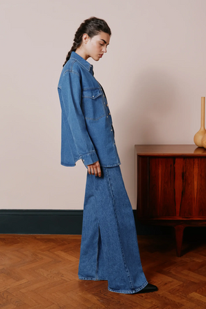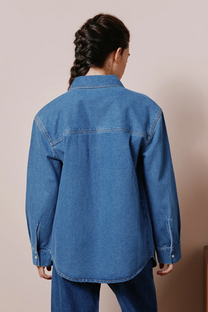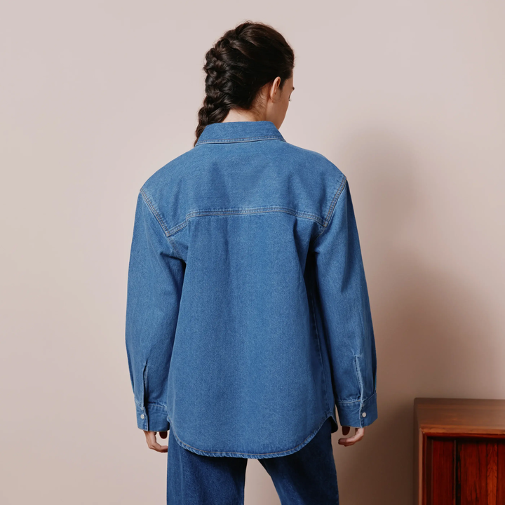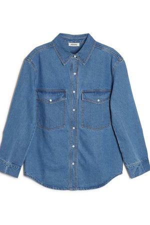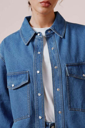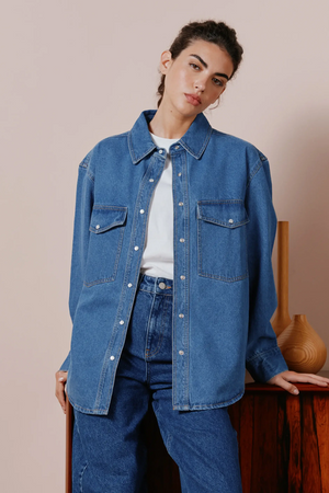 An oversized denim shirt with popper fastening, breast pockets and a curved hem.
