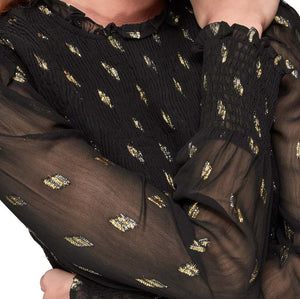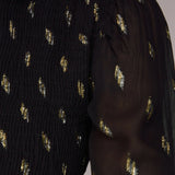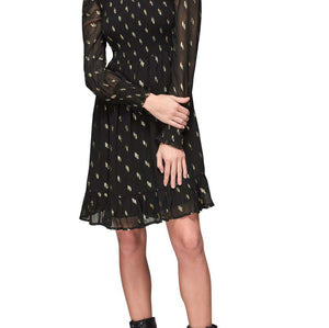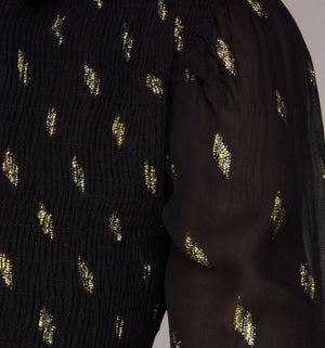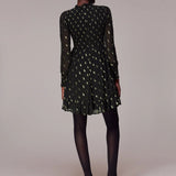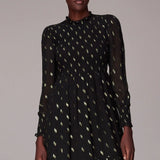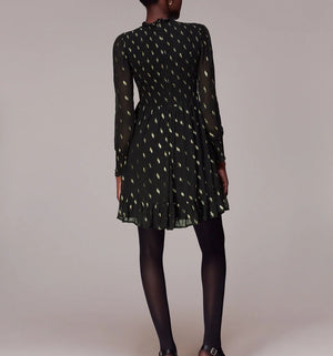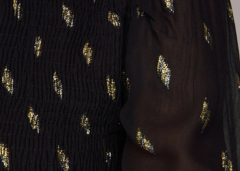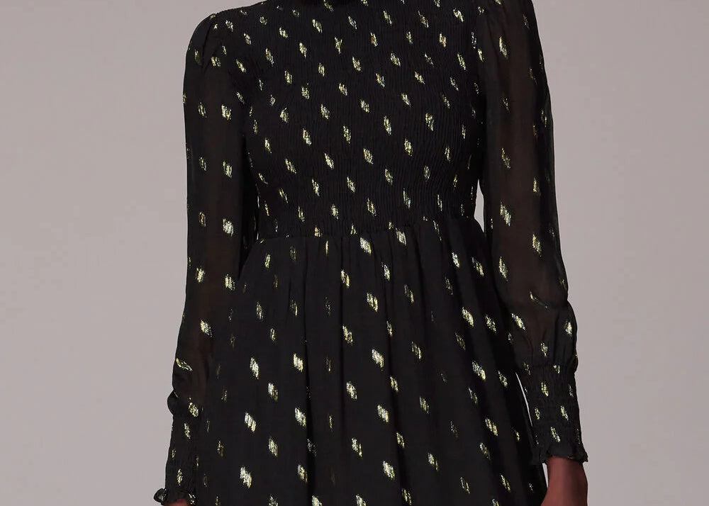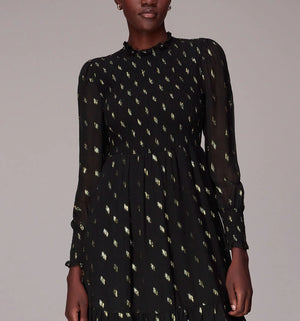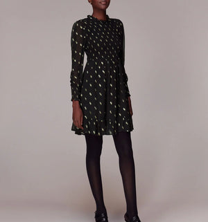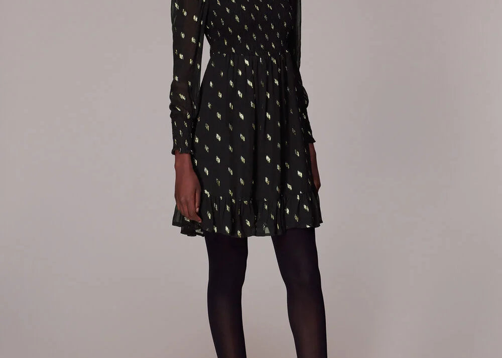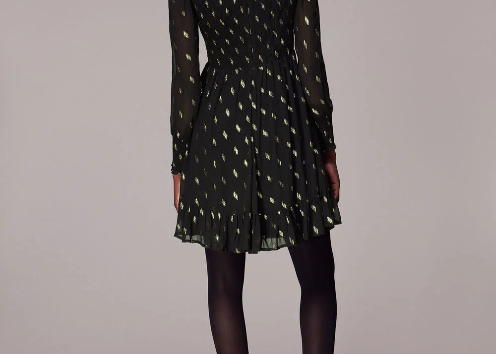 The shirred bodice creates a flattering fit that moves comfortably with your body, while frilled trims at the neckline and hem add a romantic touch. Subtle gathers at the shoulders and wrists bring texture and shape, making this the kind of dress you can wear with confidence, comfort and a little bit of sparkle.