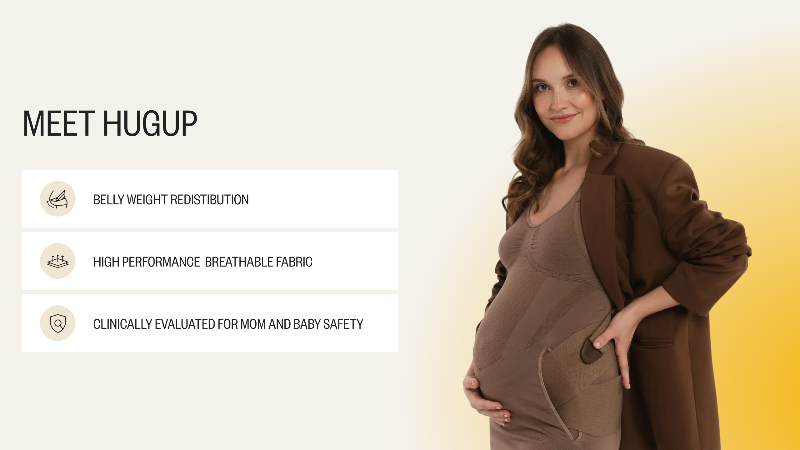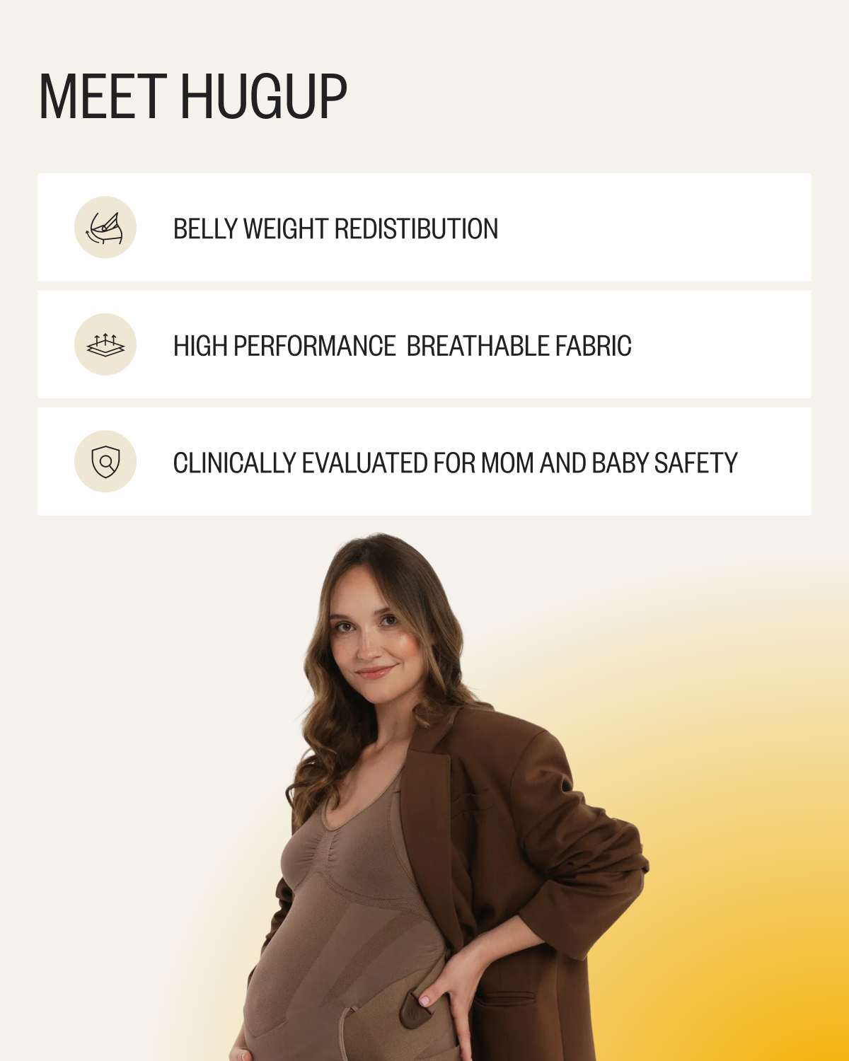 Meet Hugup - full-body support throughout the most demanding months of pregnancy, from the 5th to the 9th month. Made for women who refuse to accept that back pain and pelvic pressure are just part of pregnancy.