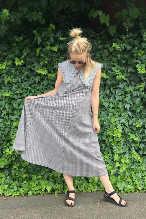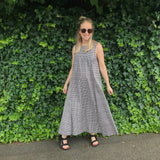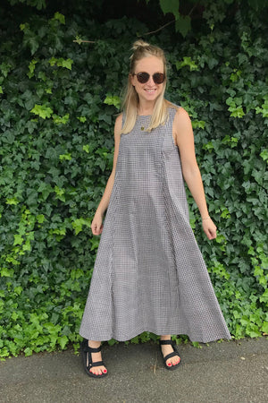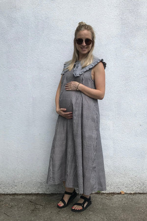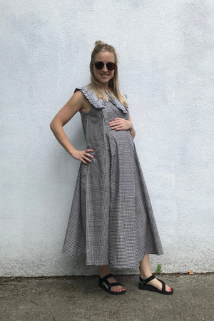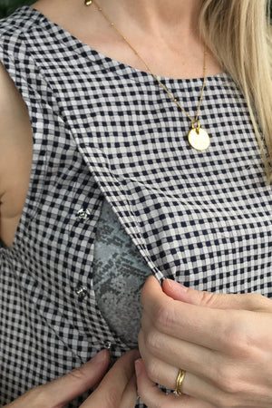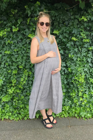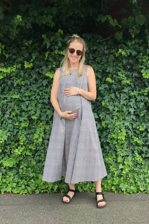 Meet the Lucy Dress in printed navy gingham cotton — made by Journy for the real moments: pregnancy, nursing, and well beyond.