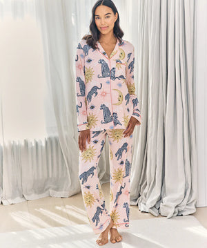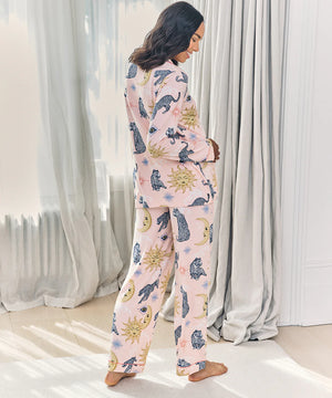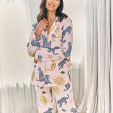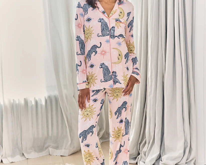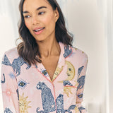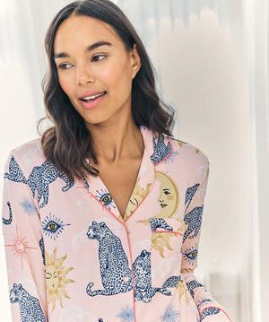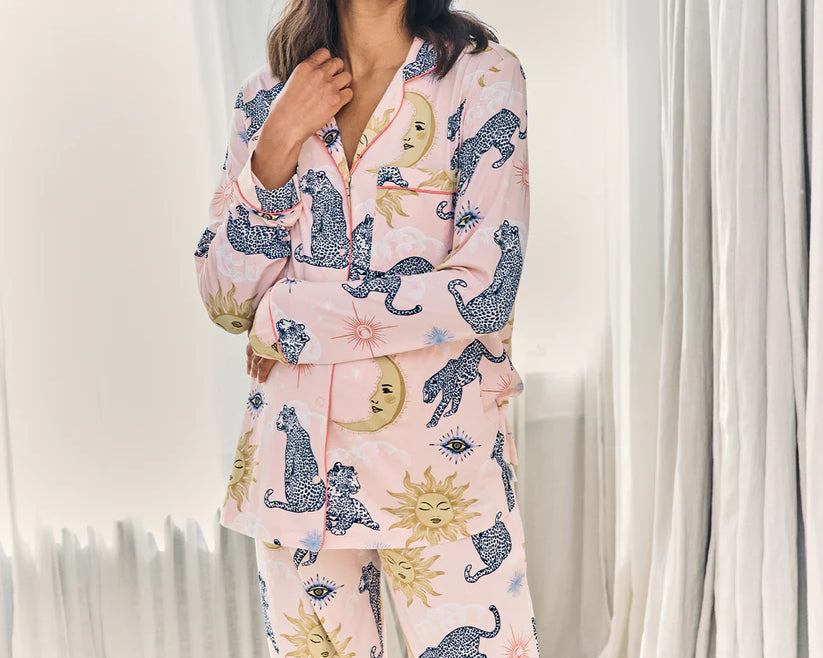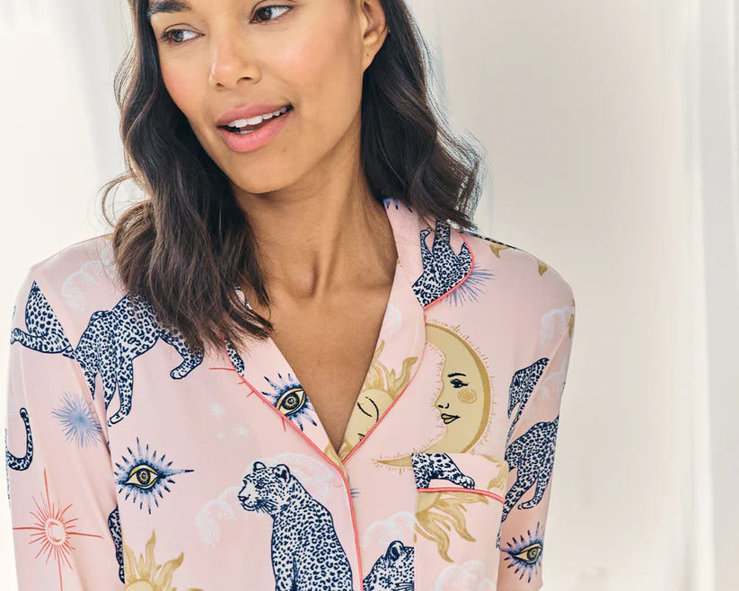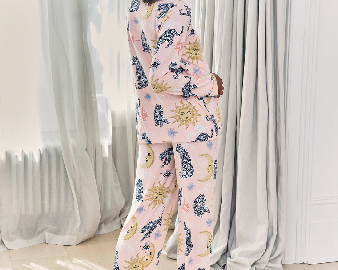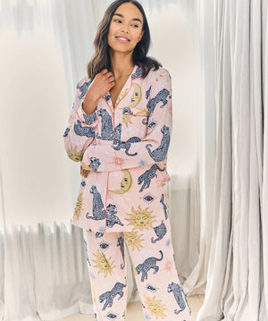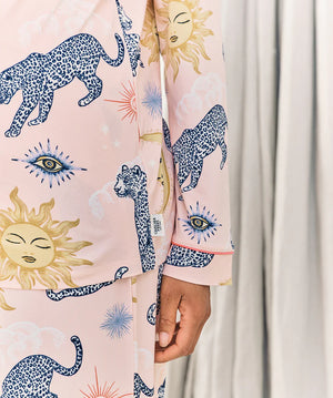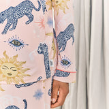 Dreamy nights start here. Chelsea Peers’ Maternity Celestial Leopard Print Pyjama Set brings comfort and a little bit of magic to every stage of motherhood. Designed in a soft pink hue scattered with hand-drawn leopards, moons, and stars, it’s made from buttery recycled jersey that feels as good as it looks.