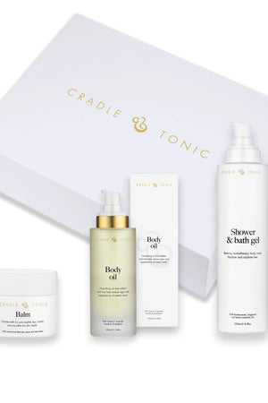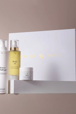 Presented in our signature Cradle & Tonic gift box, this thoughtful set includes three of our most loved natural products, crafted with 100% pregnancy safe ingredients to support skin health, hydration and radiance.