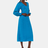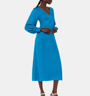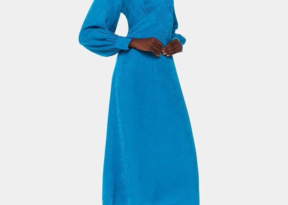 Revitalise your wardrobe by adding vibrant energy with our colourful Serpent Jacquard Midi Dress. It comes in a lively shade of blue, with a subtle print and a V-neckline. You can style it with either high heels or ballet pumps for a casual and relaxed feel.