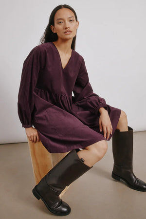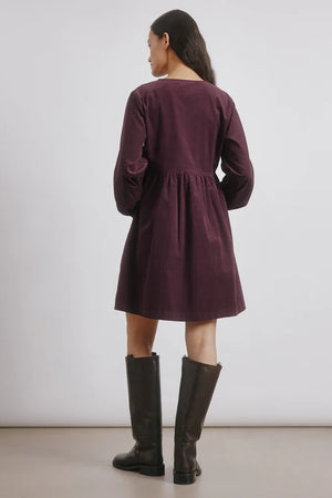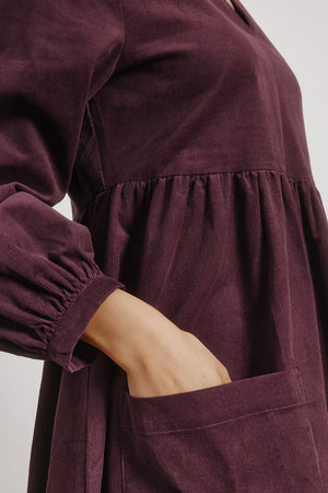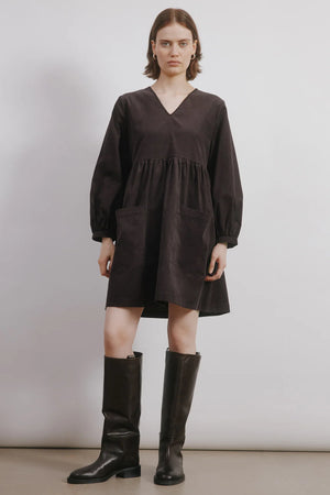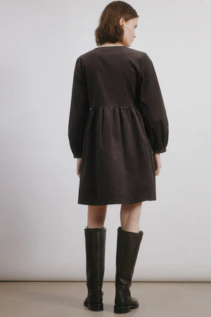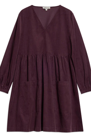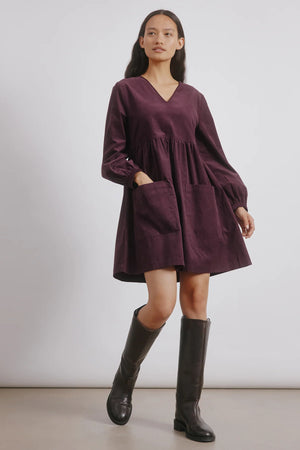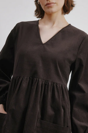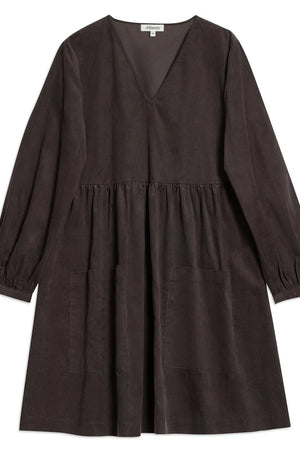 Made from soft baby cord, it offers a blouson upper with gently gathered empire seam that gives room over your stomach without feeling tight. The skirt skims with subtle swing, and front patch pockets add function without bulk. Blouson sleeves give volume at the top to balance the shorter hemline.