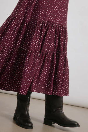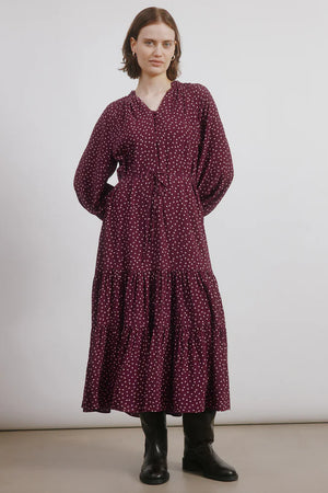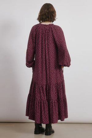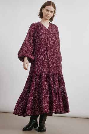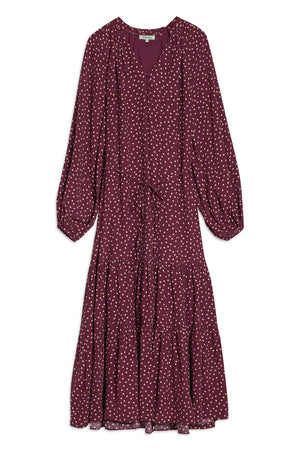 The Burgundy Spot Dress is a perfect blend of ease and elegance. The V-neck with button front gives a flattering neckline, while the blouson sleeves add volume and balance. Through the body, soft tiers create flowing shape that skims over your changing form.