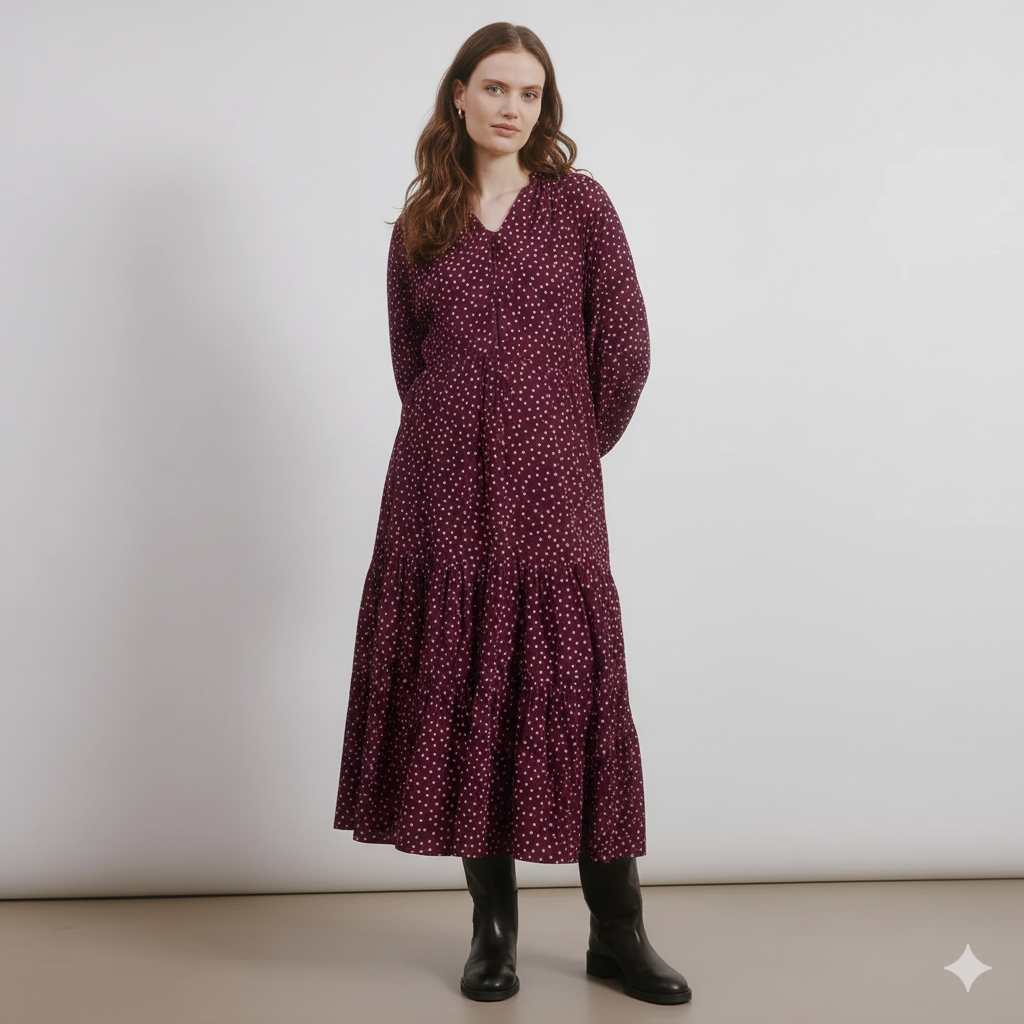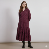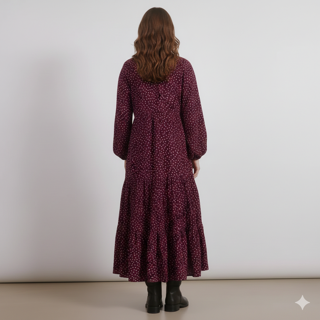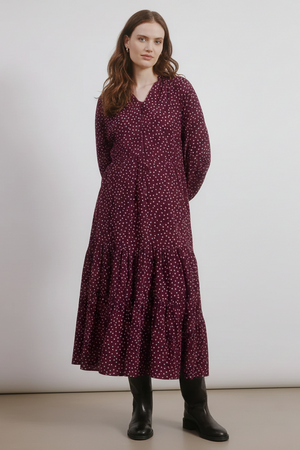 The Burgundy Spot Dress is a perfect blend of ease and elegance. The V-neck with button front gives a flattering neckline, while the blouson sleeves add volume and balance. Through the body, soft tiers create flowing shape that skims over your changing form.