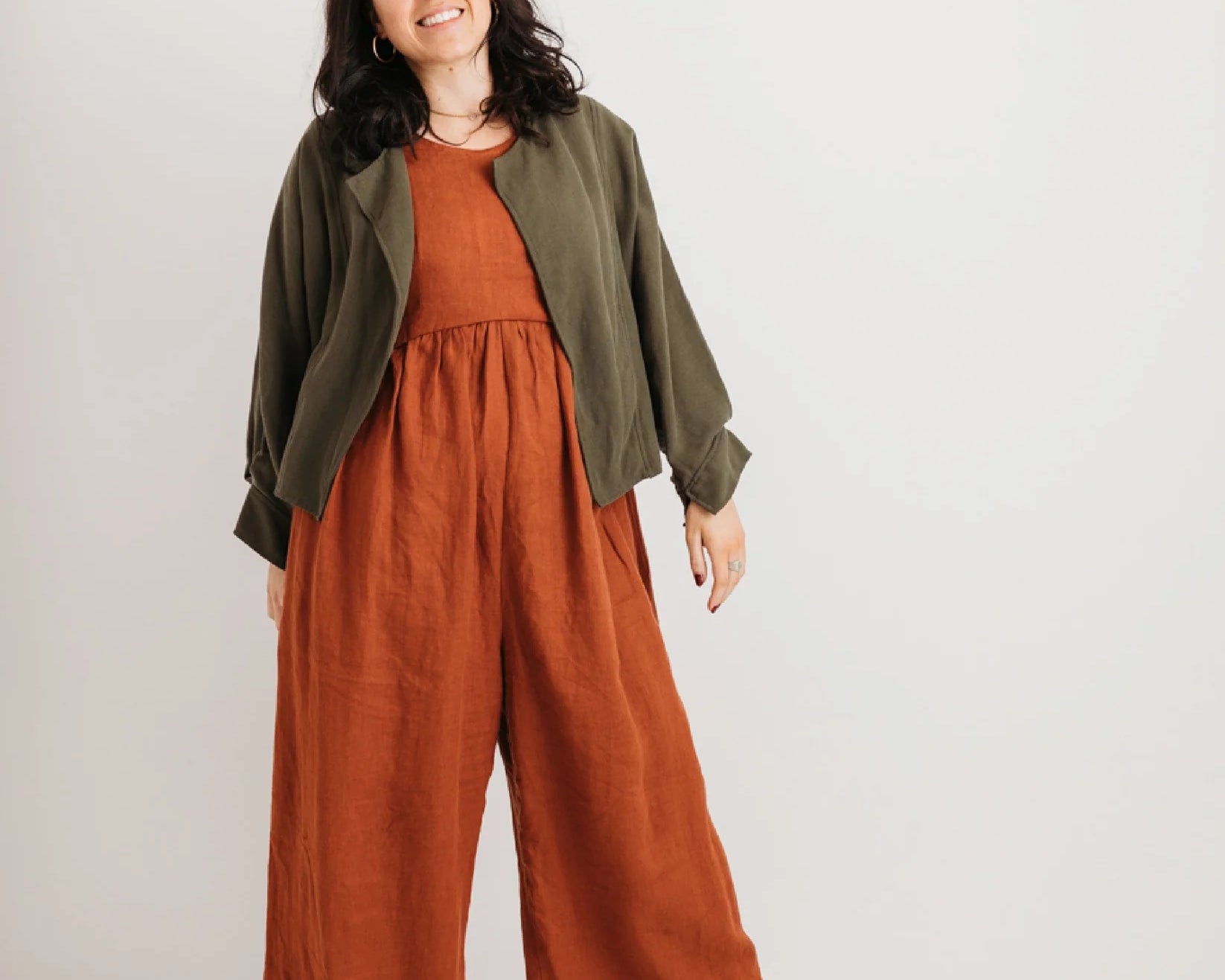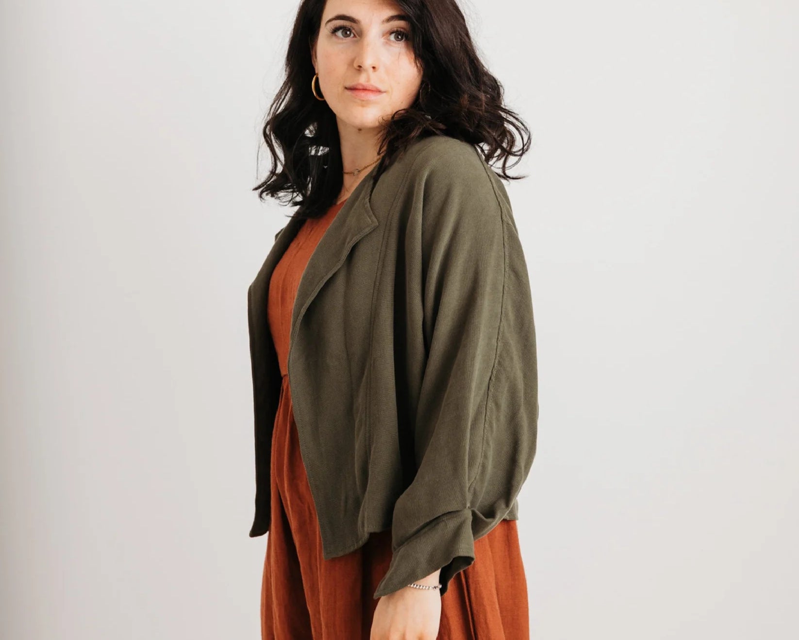 This jacket is made from soft, drapey Tencel that flows beautifully without clinging. Its relaxed open front and waterfall paneling let it sit gently over your stomach and curves. Subtle pleated back and cuffed sleeves add detail, while the silhouette remains effortless. It pairs beautifully over dresses, jumpsuits or even jeans — day to night, casual to elevated.