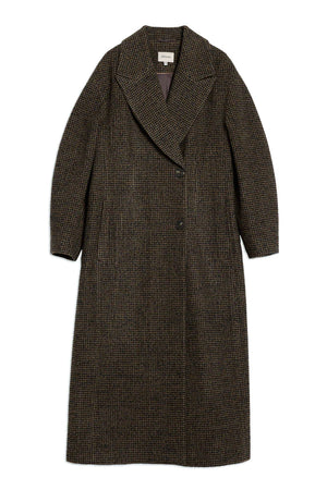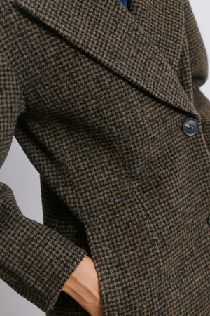 It’s cut in an oversized silhouette with voluminous cocoon sleeves that drape beautifully over your shape. The single-breasted design features horn-effect buttons and two side pockets — chic without being fussy. Made from a distinct check tweed wool blend, it layers easily over knits and adapts to your changing body. The relaxed cut means it sits comfortably over your stomach and any outfit underneath.