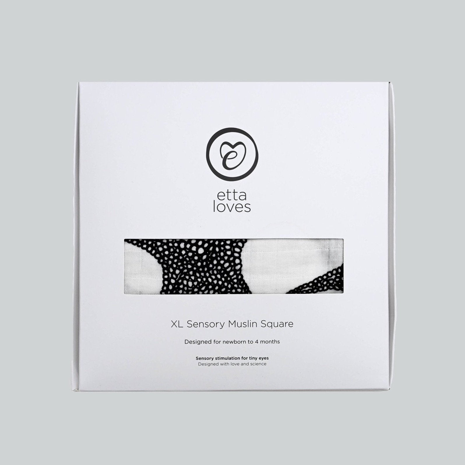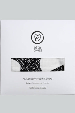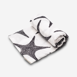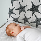 XL supersoft sensory muslin square in high contrast black and white starfish print. Designed to the millimetre to support babies' cognitive and visual development between birth and around four months.
